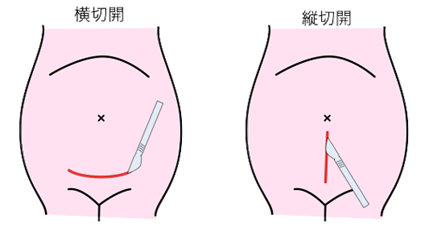 緊急時に早く胎児を娩出する必要があるときなどは、下記の右図のような下腹部縦切開になる場合があります。
